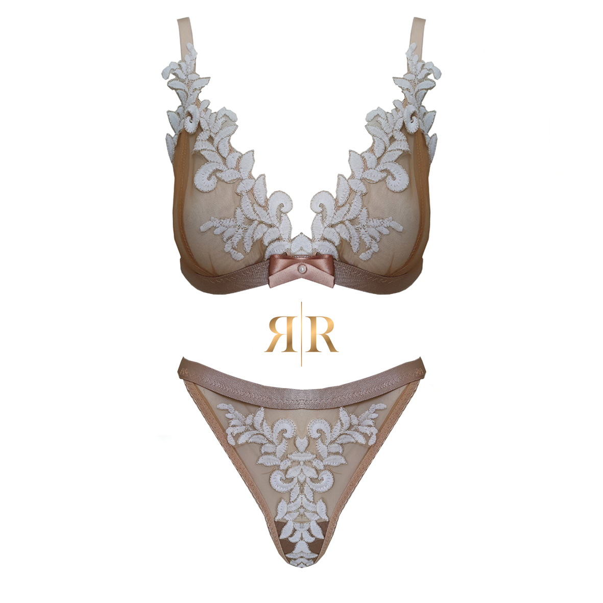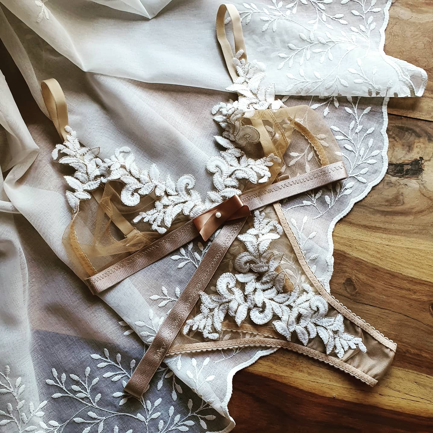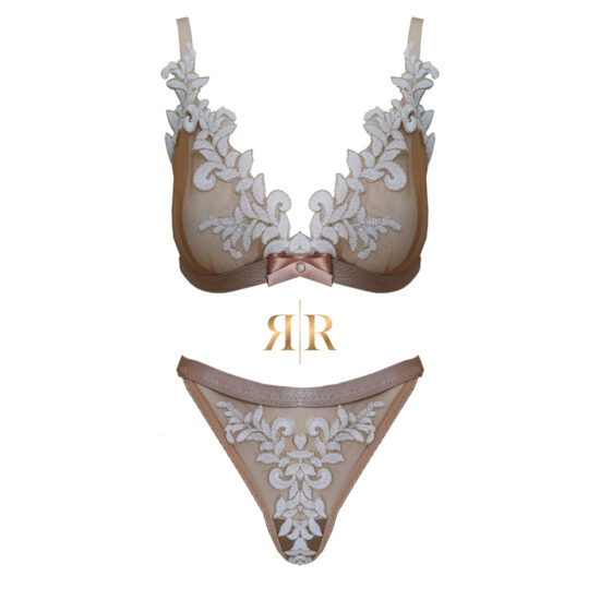 Set Bride to be din tull culoarea pielii cu aplicatii de broderie alba.